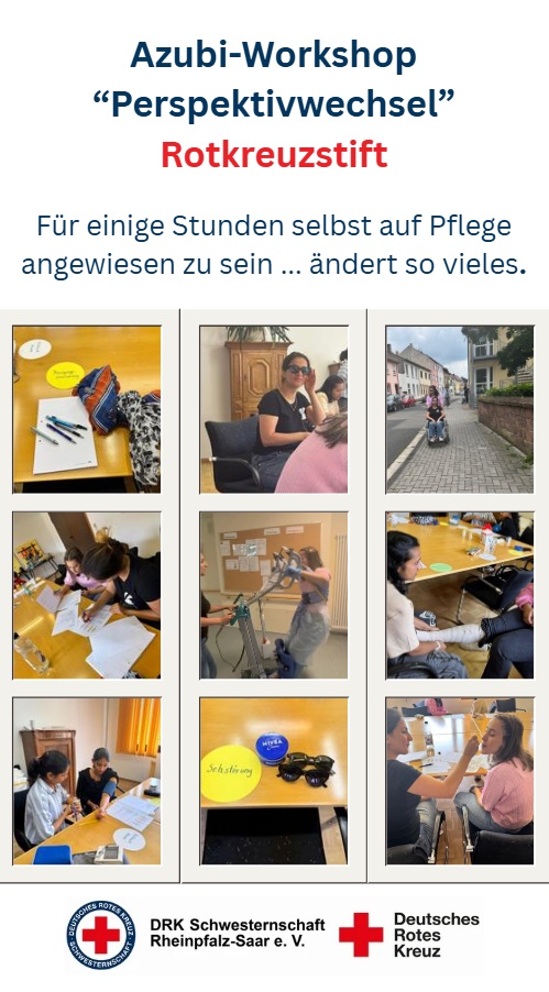 Erleben, was ein Pflegebedürftiger erlebt: Mit unseren Praxisanleiterinnen im Rotkreuzstift haben unsere Neustadter Azubis den Perspektivwechsel gewagt, haben sich füttern und im Rollstuhl schieben lassen, mit beeinträchtigtem Sehvermögen und körperlichen Einschränkungen gekämpft. Empathieförderung und Verbesserung der Fähigkeiten durch persönliche Betroffenheit - effektives Lernen mit Spaßfaktor.